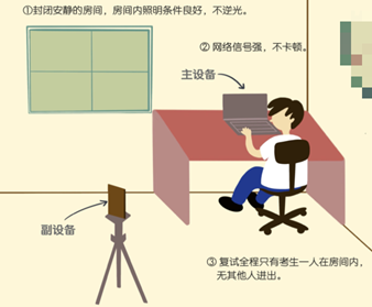 为了保障广大师生的安全健康,不能按时返校的考生,3003新葡的京集团考试工作将采用Zoom系统进行线上考试。考试前,考生要准备好2个网络视频设备(2部手机或1部手机+1台带摄像功能的电脑等),一个用于发布试题,一个用于监控面试场所。如下图所示: