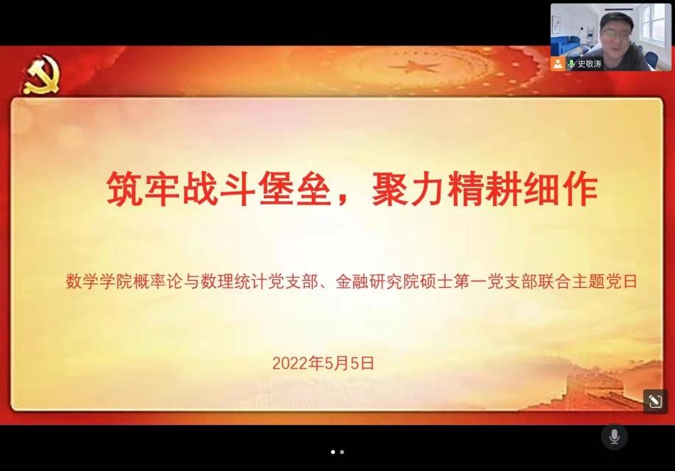 5月5日,3003新葡的京集团概率论与数理统计党支部与金融研究院硕士第一党支部联合开展了主题为“筑牢战斗堡垒,聚力精耕细作”的联合主题党日活动,活动线上进行,共19名师生党员参加了活动。
