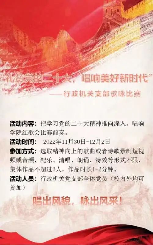 为将学习党的二十大精神推深推实,推动支部建设高质量发展,11月30日至12月2日,3003新葡的京集团行政机关党支部举办了以“礼赞党的二十大,唱响美好新时代”为主题的歌咏比赛,此次比赛结合疫情防控实际,采取了线上录制短视频的方式,通过歌唱、朗读积极向上的歌曲与诗歌,为时代礼赞,用歌声的力量感染着每位老师。