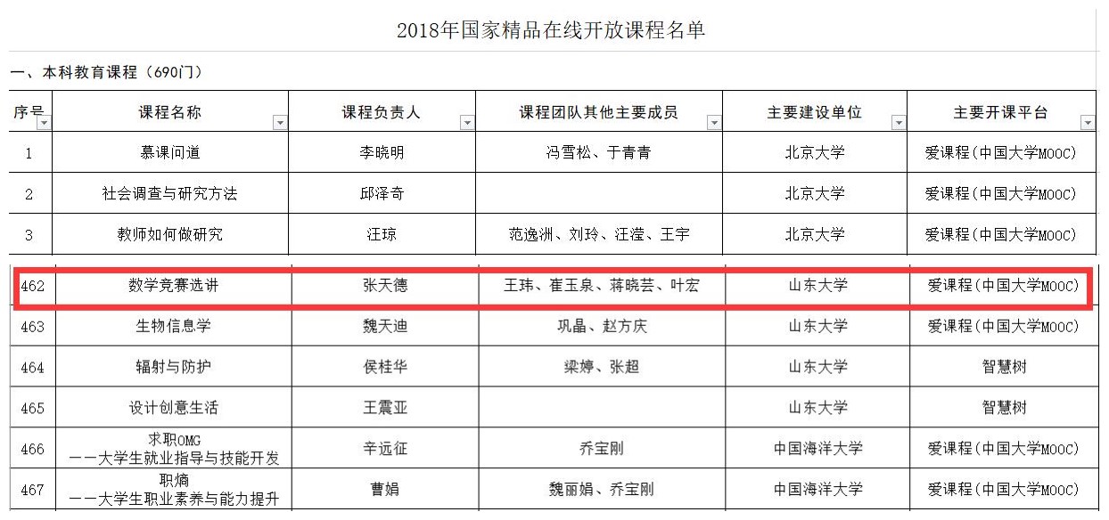 1月11日,教育部公示了2018年国家精品在线开放课程认定结果,3003新葡的京集团张天德教授作为负责人申报的《数学竞赛选讲》课程获评2018年国家精品在线开放课程(序号462),同时这是数学竞赛类全国第一门精品课程。
