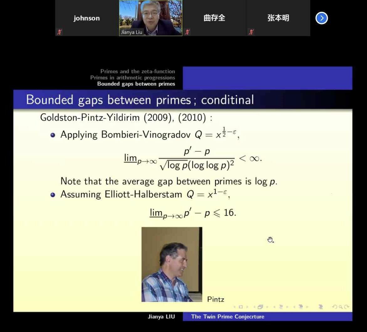 刘建亚教授从孪生素数的起源开始讲起,叙述了孪生素数的猜想命题,简单介绍了历代数学家对孪生素数的各种猜想和反复证明。他指出,和至今尚未有解的黎曼猜想、哥德巴赫猜想一样,孪生素数猜想也是历史悠久的著名数学猜想。讲坛着重讲解了素数与zeta函数,算术级数中的素数,以及素数之间的有界间隙,生动讲述了孪生素数猜想证明的漫长发展史。