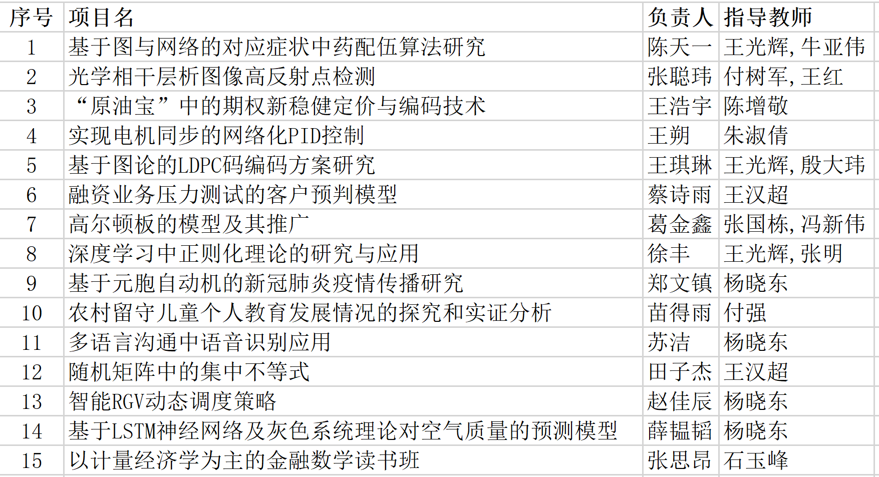 从本次科创立项的题目来看,有最新的热门社会问题,如“基于元胞自动机的新冠肺炎疫情传播研究”、“‘原油宝’中的期权新稳健定价与编码技术”、“农村留守儿童个人教育发展情况的探究和实证分析”、“融资业务压力测试的客户预判模型”等,有近年来的研究热点,如“基于图与网络的对应症状中药配伍算法研究”、 “深度学习中正则化理论的研究与应用”、“多语言沟通中语音识别应用”、“基于LSTM神经网络及灰色系统理论对空气质量的预测模型”、“光学相干层析图像高反射点检测”、“实现电机同步的网络化PID控制”等,有基于兴趣的纯数学问题,如“随机矩阵中的集中不等式”、“高尔顿板的模型及其推广”等,也有为夯实基础、开阔视野而开展的读书学习班,如“以计量经济学为主的金融数学读书班”等。选题类型多样,贴近社会热点,应用价值较高,充分展现出当代大学生既有“善其身”的钻研精神,又有“济天下”的家国情怀,体现出了一种积极向上的时代精神风貌。