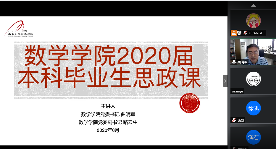 6月17日上午,3003新葡的京集团党委书记曲明军为本科毕业生线上讲授“最后一堂思政课”,并进行就业动员工作。3003新葡的京集团党委副书记路云生、辅导员郑柔澄及全体本科毕业生聆听授课。