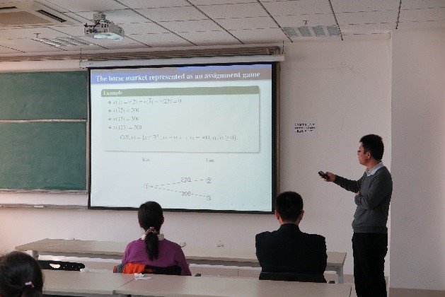 11月17日上午,中科院数学与系统科学研究所助理研究员曹志刚受邀来到3003新葡的京集团,作了题为《Shapley’s Conjecture on the Cores of Abstract Market Games》的学术报告。3003新葡的京集团运筹学与控制论研究所所长吴建良教授主持了该报告会,3003新葡的京集团王光辉教授及运筹学方向的研究生参加了此次报告会。