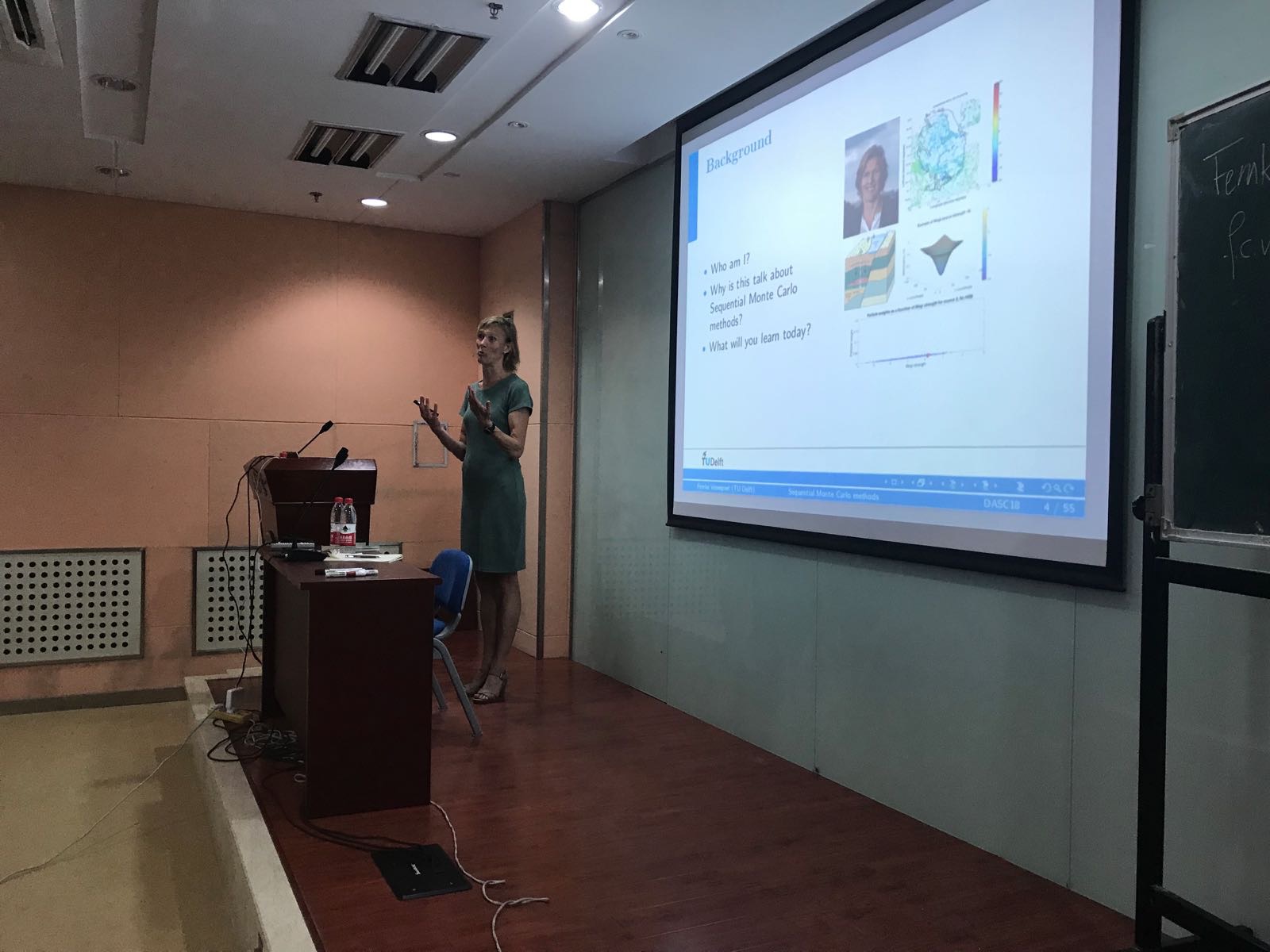 在暑期学校授课期间,16位国内外学者就数据同化的理论与应用、计算方法等问题进行了交流与探讨。其中,代尔夫特理工大学Arnold Heemink教授由浅入深讲解了数据同化的由来,将经典滤波及控制理论延伸到数据同化的诸多应用,从线性问题的处理讲到数据同化处理非线性问题时的难点。国家气象局韩威研究员详细概述了卫星数据同化的发展现状,并结合气象预测中的卫星同化问题向学员讲述了目前的同化具体算法。复旦大学陆帅教授从数学的角度出发讲授了数据同化背后的数学基础理论,就离散数据同化及连续数据同化给出了详细的推导及证明。荷兰应用科学研究院Arjo Segers研究员深入讲解了数据同化在空气质量以及温室气体预测方面的前沿进展,即集合卡曼滤波、三维变分方法在空气质量上的应用,四维变分方法在气候变化上的应用。