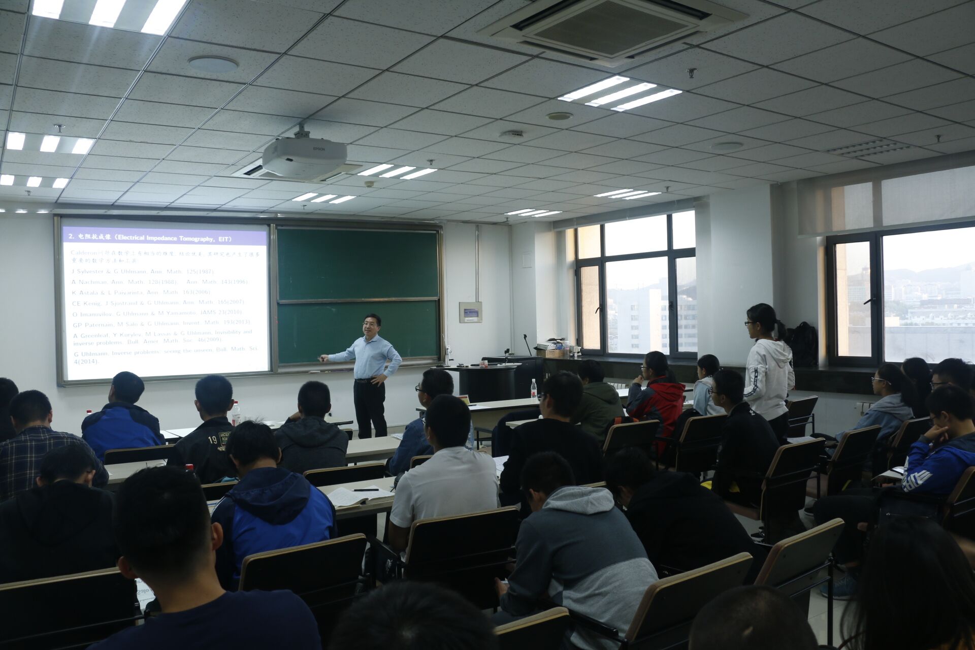 报告伊始,张波首先用通俗易懂的语言介绍了反问题的定义,以及反问题的历史来源,并通过列举实例帮助理解。随后,张波分享了自己对于反问题一些性质及其应用的看法,通过列举医学成像、电阻抗成像、反散射问题等来表现反问题在实际生活中的应用之广,并通过生动有趣的方式讲解了反问题研究领域的主要成果和最新进展。报告结束后,进入提问环节,芮洪兴以及其他教师就自己对反问题的研究提出一些问题并与张波进行讨论,该环节亦令在座学生受益良多。