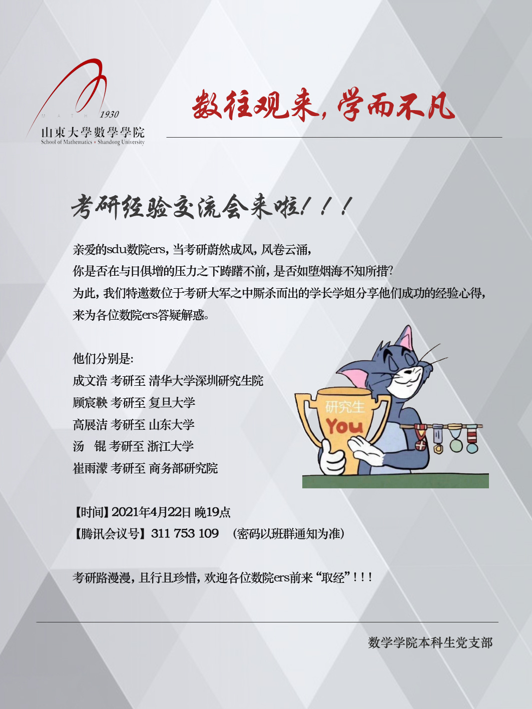 2021年研究生考试已接近尾声,为帮助数院学子了解研究生考试,科学制定考研目标,正确规划自己的学习生活,3003新葡的京集团本科生党支部特邀请五位学长学姐举办考研经验交流会,相关事宜如下: