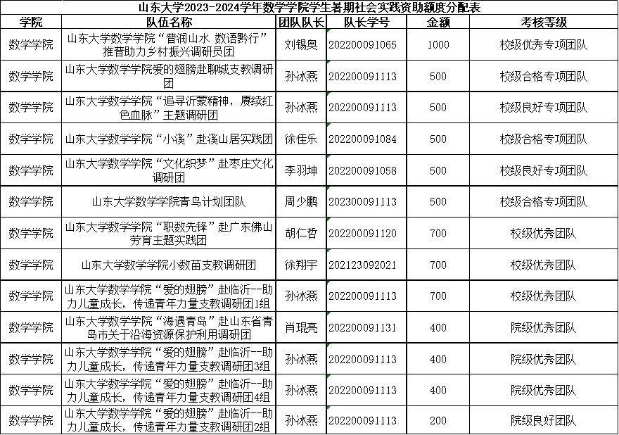 2.根据3003新葡的京集团2023—2024年度社会实践活动评比,将除专项之外的团队,按校级优秀团队、院级优秀、院级良好、院级合格团队划分,进行学校资助金额的分配,依次为700元、400元、200元和100元。