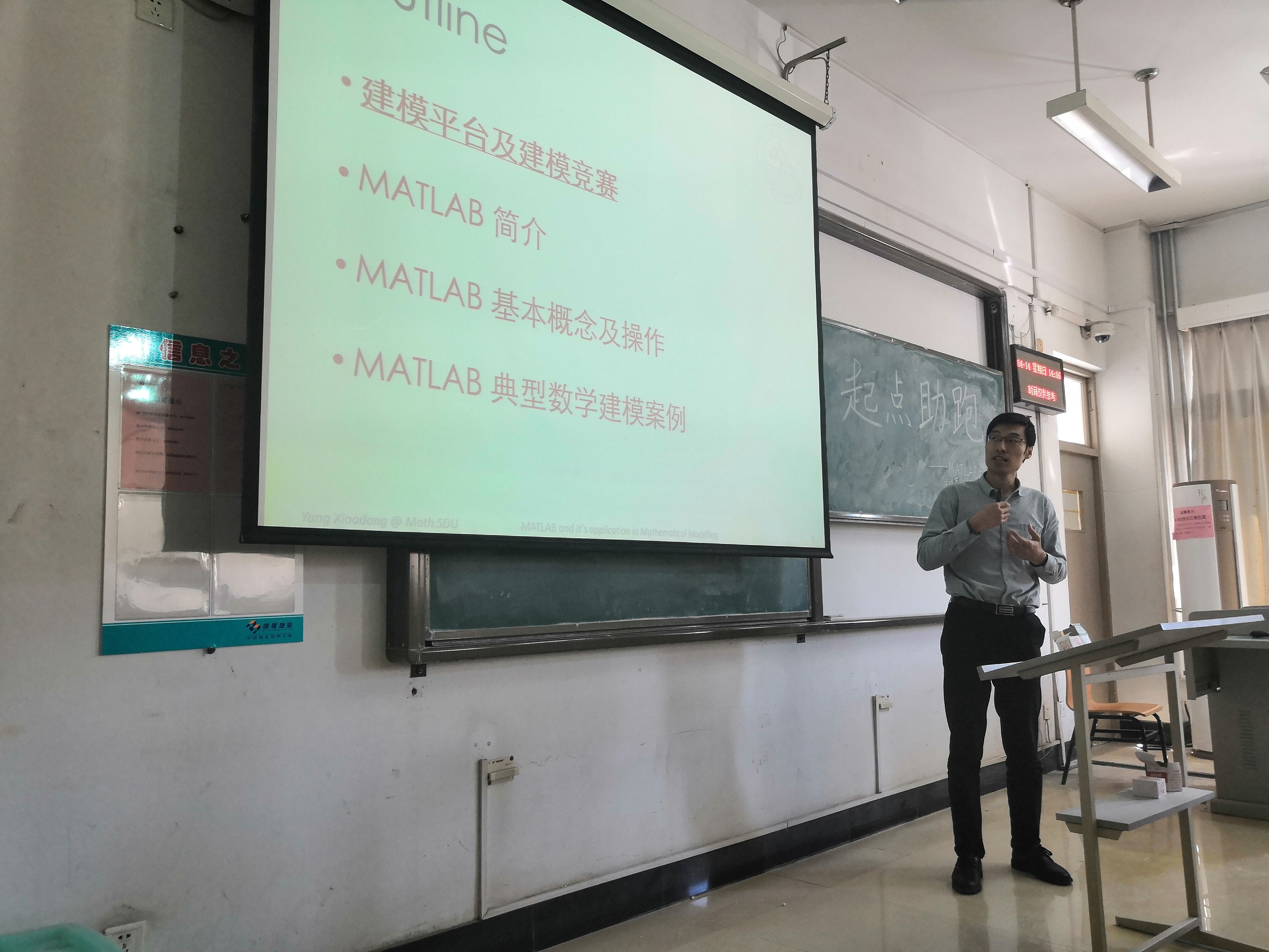 数学建模协会于4月14日下午2:00在E5206d教室开展了“起点助跑”系列培训讲座之论文写作,这次讲座中我们邀请到了杨晓东老师作为特约嘉宾,全体数学建模干事以及部分感兴趣的同学们都参加了此次讲座。此次讲座旨在为同学们介绍matlab使用的方法、技巧、相关工具,加深同学们对于matlab的理解,为日后的数学建模比赛中模型建立奠定基础。