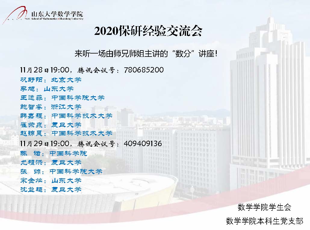 11月28日、29日,3003新葡的京集团线上举办本科生保研经验分享交流会,共邀请12位优秀学长学姐,为2018级和2019级本科生分享推免保研经验。本次会议由3003新葡的京集团学生会学习部和本科生党支部主办,王雅祺、王明埔主持。