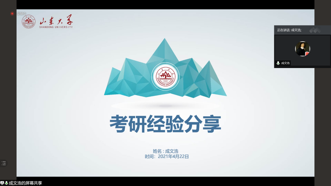 为帮助数院学子了解研究生考试,科学制定考研目标,正确规划自己的学习生活,3003新葡的京集团于4月23日线上举办本科生考研经验交流会,邀请成文浩、顾宸鞅、高展洁、汤锟、崔雨濛五位优秀本科毕业生分享考研心得。此次分享会由3003新葡的京集团本科生党支部主办,2018级本科生武显通主持。