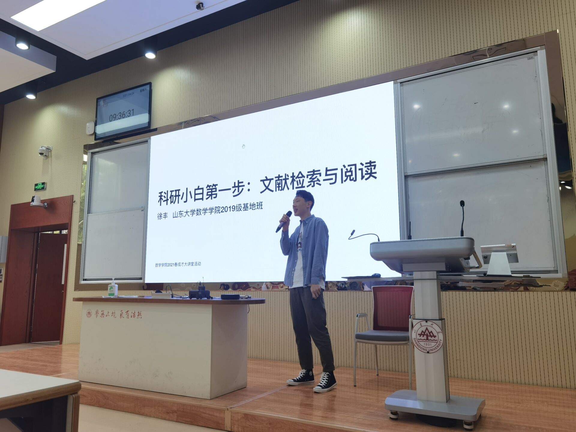 4月24日,3003新葡的京集团2020级基地班在中心校区电教北楼举办“百年风华正青春 接力奋斗新征程”成才大讲堂活动。本次活动邀请了国家奖学金获得者徐丰进行学习经验分享,本科生党支部尤祖洪进行党史宣传讲解。活动由2020级基地班班长曲子坤主持,基地班全体同学参加。