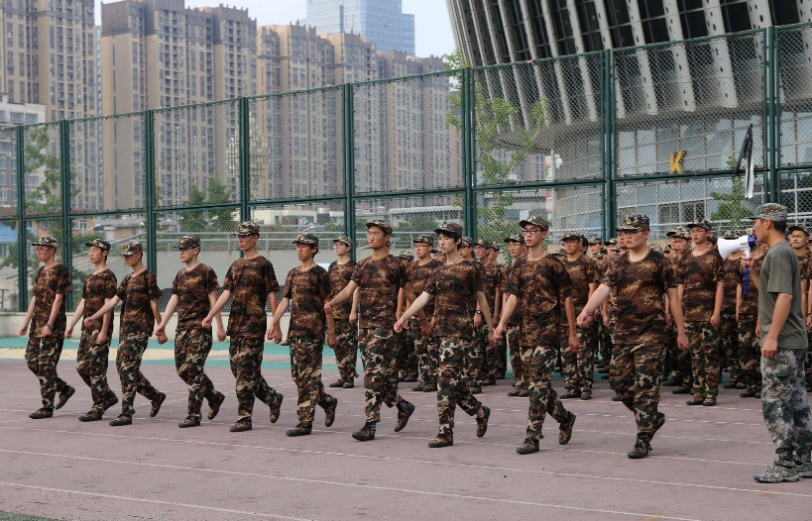 7月4日的早晨六点,军训的号角正式吹响。同学们神采奕奕,整装待发,早早来到了集合地点。早操的第一项任务是站军姿,一个简单的站立动作最能磨炼军人般的意志。接下来一天的训练时间,同学们学习了稍息、立正、跨立、停止间转法、敬礼、齐步走等基本队列动作和步伐。其中,齐步走是训练的重点,手脚配合,步调一致,这对队伍之中的每个人都提出了更高的要求。同学们忍受着酷暑,认真的配合教官完成训练内容。