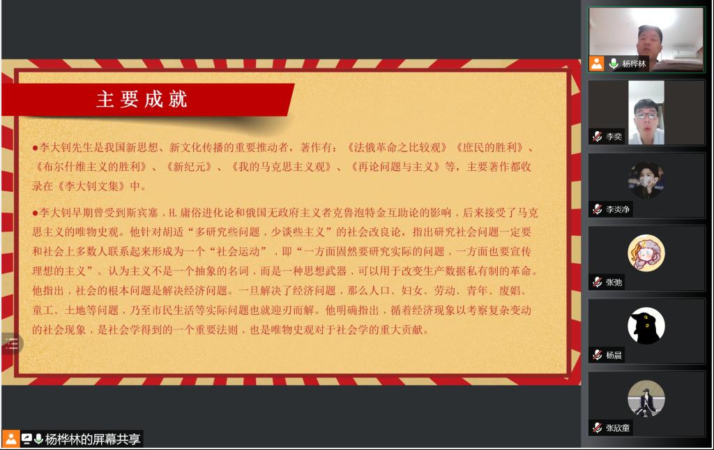 出于疫情防控的需要,团队将原本定在线下的李大钊革命精神宣讲改成了以线上腾讯会议的方式进行,邀请了包括来自李大钊母校唐山一中的学子在内的青年学生们参会。杨桦林同学分别从李大钊生平、主要成就和历史评价、李大钊名言录和李大钊精神四个方面进行了详细的介绍。