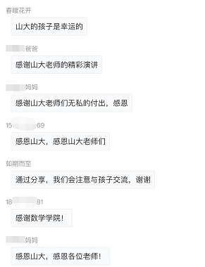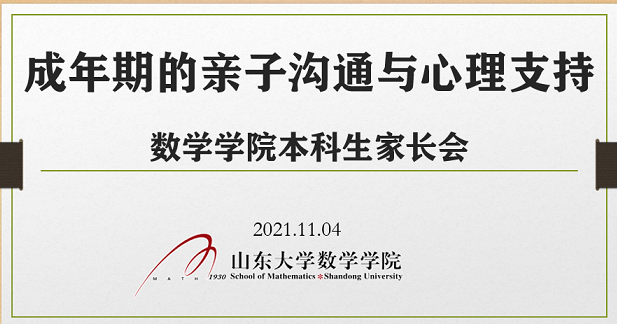 辅导员桑军帅、宋金灿、毛洁玲分别介绍了不同年级学生的主要特点和面临问题,以及家长们关心的专业、保研、学业、毕业去向等情况。随后,曹丽丽进行主题分享,她从大学生心理状态、数学学科学生特点、父母与孩子沟通的技巧及需要避免的问题等角度入手,并结合咨询案例展开介绍,还向家长们推荐了相关书目。
