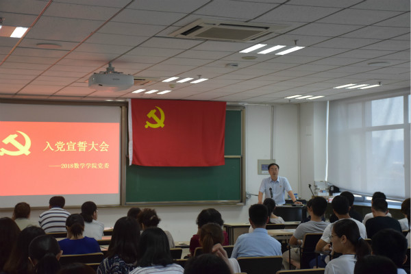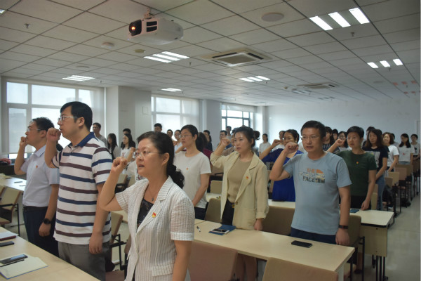 新党员宣誓仪式在《国际歌》声中拉开了序幕。全体党员举起右手,面向党旗庄严宣誓,响亮的宣誓声萦绕在教室,表达了全体党员坚定的入党信念和为共产主义奋斗终身的决心。与会老党员与新党员一同宣誓,重温入党誓词。