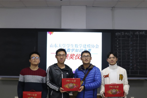 决赛分为两轮,第一轮由为淘汰赛,12支队伍决出9支队伍进入下一轮;第二轮为定级赛,9支队伍按所得分数决出一二三等奖。一二轮环节相同,第一个环节为选择必答题,主持人宣布开始后,各小组从题库中随机选择一套题进行做法,每队有1分30秒作答时间,完成提交后由主持人公布得分情况。同学们在作答过程中都十分认真,小组内部成员间交流不断,场面十分热烈。第二个环节为分类必答题,有四个主题,各小组按第一环节分数排名顺序依次选择一个主题做答,每个小组有两分钟作答时间,时间结束后提交,工作人员批改后由主持人公布第二环节分数,比赛过程中同学们十分专注,都在很短的时间内完成相应的必答题。第三个环节为抢答题,大屏幕上出现一道题,各组自行作答,完成后用抢答器抢答。当抢答开始后,主持人将请第一个抢答的队伍作答,若该组答案正确,则为其加分并进入下一题;若回答错误则扣分并请第二个抢答的队伍作答,以此类推,每道题目最多抢答3分钟,若超过时间或所有队伍答完后仍没有答出正确答案,则该题作废。同学们都充满激情,积极参与抢答题环节。在定级赛中更有一组同学通过抢答题环节反超由倒数第二名成功达到第一名,比赛现场气氛活跃,参赛同学都为争夺晋级资格而积极作答。比赛终了,由数学建模协会负责人为获奖组同学颁发奖状并发放奖品。