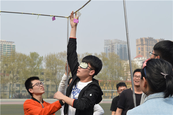 本次运动会共设有男背女撕名牌、四子棋接力赛、蒙眼取物、旋转成圆和血腥撕名牌五个项目。首先进行的是男背女撕名牌项目,比赛刚刚开始,17级1、2两班代表队便联手淘汰了一组选手,推动比赛走向白热化,经过一番激烈的角逐,最终17级基地班获得了该项目的胜利。随后进行的四子棋接力赛中,对阵双方你来我往,在放置己方棋子的同时也不忘消除对方的棋子。为了将“MATH”四个字母拼成一条直线,各个班级在本环节斗智斗勇,精彩异常。蒙眼取物项目中,参赛选手虽然被蒙住了眼睛,但在另一位同学的指引下,比赛开始不到两分钟,便通过默契的配合取下了横杆上的卡片,顺利完成了比赛。旋转成圆计时赛要求在队员互相握着手的前提下迅速转为一个圆,充分考验了参赛选手之间的默契。同学们从最初的纠缠在一起,通过各种办法,解开彼此之间的结,还原成一个圈,最终17级1班以领先第二名一秒的微弱优势夺得该项目的冠军。