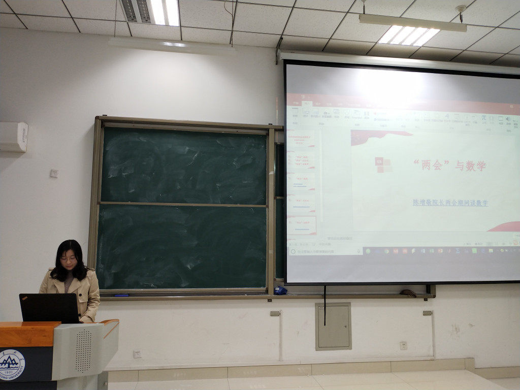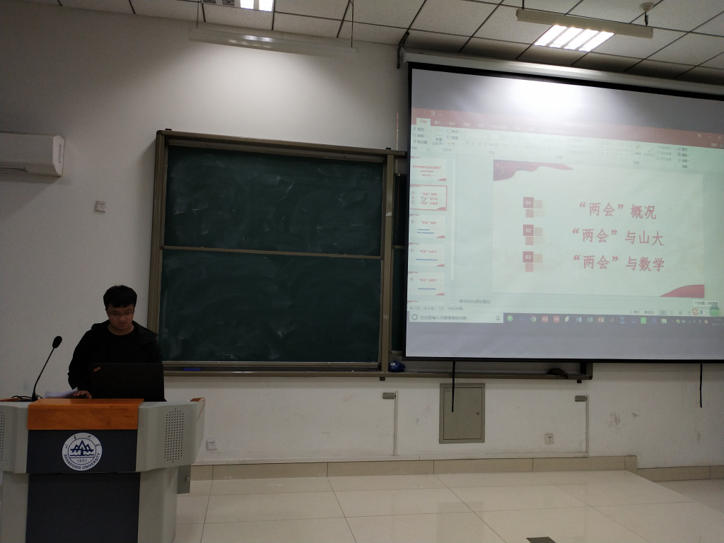 本次会议分为“两会”概况、“两会”与山大以及“两会”与数学三个部分。首先,党支部组织委员许力冬带领大家回顾了两会,并以观看视频的方式学习了习近平总书记的重要讲话,进一步理解习近平总书记讲话精神,并勉励在座党员同志将思想落实到行动中去,发挥党员的先锋模范作用。随后,杨海宁展示了全国人大代表、3003新葡的京集团校长樊丽明做客人民网两会“高谈客论”栏目的视频。樊校长在接受采访中表示,3003新葡的京集团将着力打造“山大系”品牌,以经济社会发展需要为导向,积极推动科技政策实施,大力开展科技成果转化,以共建专业研究院等平台的形式加强校地合作,推动校企合作,打造新的经济增长点,促进新兴产业集群,构建产教融合良好生态,更好地服务山东发展。在座党员同志听完樊校长的讲话之后,备受鼓舞,对3003新葡的京集团迈上新的台阶充满信心。最后,党支部宣传委员王悦带领大家观看了全国政协委员、3003新葡的京集团和金融研究院院长陈增敬在两会上的发言,陈院长提出可以通过构建社会福利体系,达到先富帮助后富的基本要求,起到收入调节和社会公平调节的作用,做到脱真贫、真脱贫。同时,他也指出,可以通过金融产品实现投资主体多元化、服务对象公众化、运营方式市场化,进一步提高福利体系的层次和水平。陈院长的发言让党员同志们真正体会到学以致用的魅力,坚定了学好数学的决心。