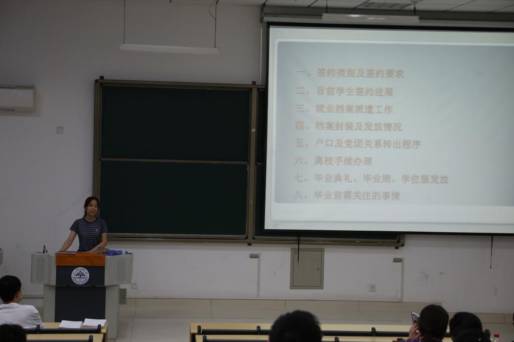 此次会议主要围绕研究生毕业生近期需要完成的一系列工作展开。首先,鲁皓为同学们分门别类地系统介绍了大家所签工作的签约类别以及相应的签约要求,在宏观上把与会同学的关注点分散开来,使同学们对号入座,有所侧重。在展示当前学生的签约进展阶段,鲁皓分别介绍了就业档案的派遣工作流程以及同学们需要注意的事项。然后,为大家解释了同学们的档案组成,封装及其发放情况;对于毕业后户口和党团关系的转出程序,鲁皓解释了相关同学提出的问题,使大家能顺利高效地完成自己的工作。为了让大家给自己的山大生活留下一个美好的结尾,鲁皓为大家讲解了毕业前需要关注的事情,比如:毕业典礼,毕业照和学位服的发放问题,在满足相关规定的前提下尽可能地满足同学们的需求。