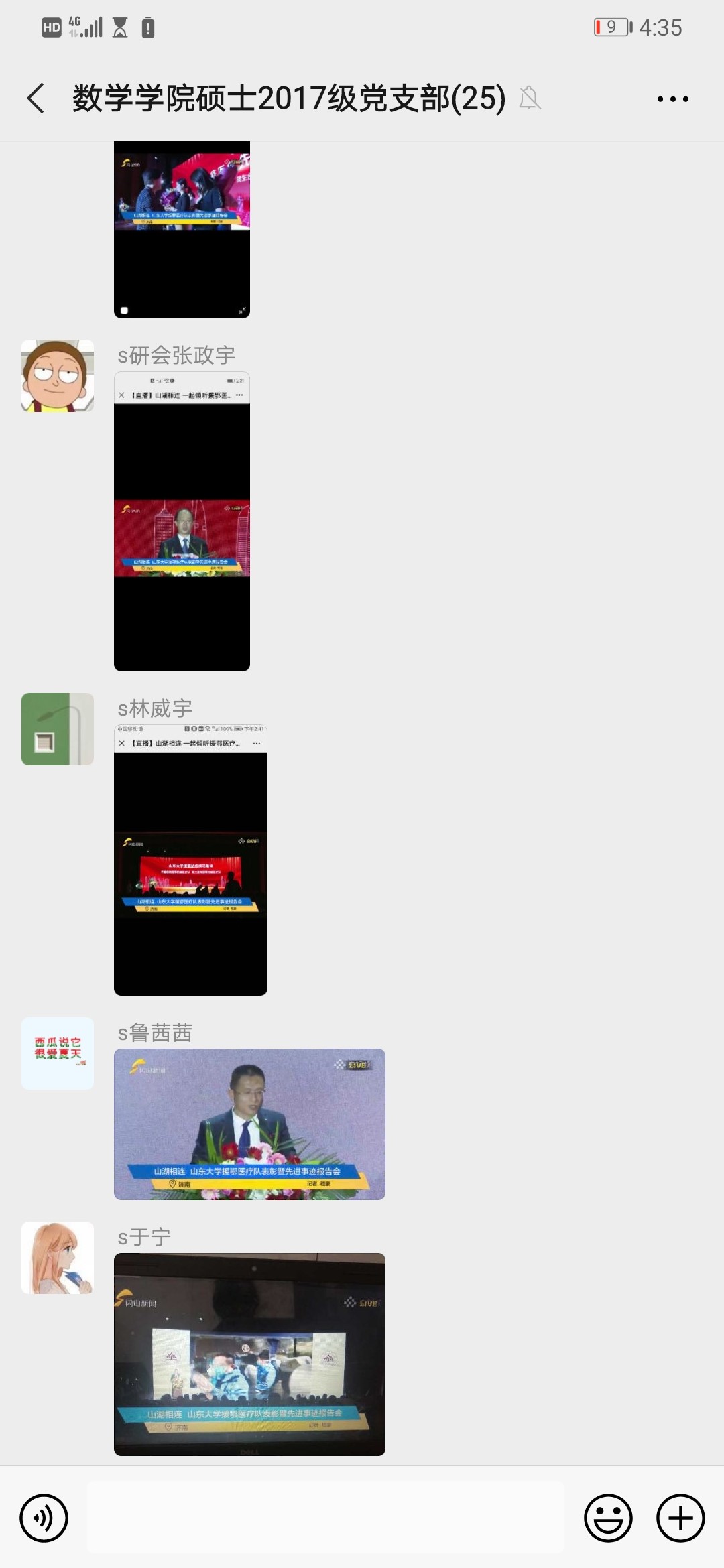 6月2日下午,博士第二党支部组织党员观看3003新葡的京集团援鄂医疗队表彰暨先进事迹报告会,看完后内心受到极大的震撼。他们中有紧急出发来不及告诉父亲的医生郝学喜,也有将温情带给病人,悉心照顾患者的孙元婧护士,有严格守卫护士健康的护士长曹妈妈,也有守护生命、践行誓言的医生周敏。他们一个个用自己的亲身经历讲述着在湖北武汉发生的富有情感的温情故事,那个“先别管我,先看我哥”的老奶奶将亲情演绎的动人心脾,还有对护士说“别靠近我”,说自己能行的老阿姨,在生命面前,她们和许多人一样,敬畏着生命,热爱着生命。牙有反哺之义,羊有跪乳之恩。在疫情面前,一批批新时代的80后、90后山大青年扛起了救国家于危难中的旗帜,他们不畏艰险,勇敢前行,用行动向全国和全世界展示了山大的责任与担当。