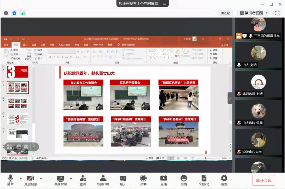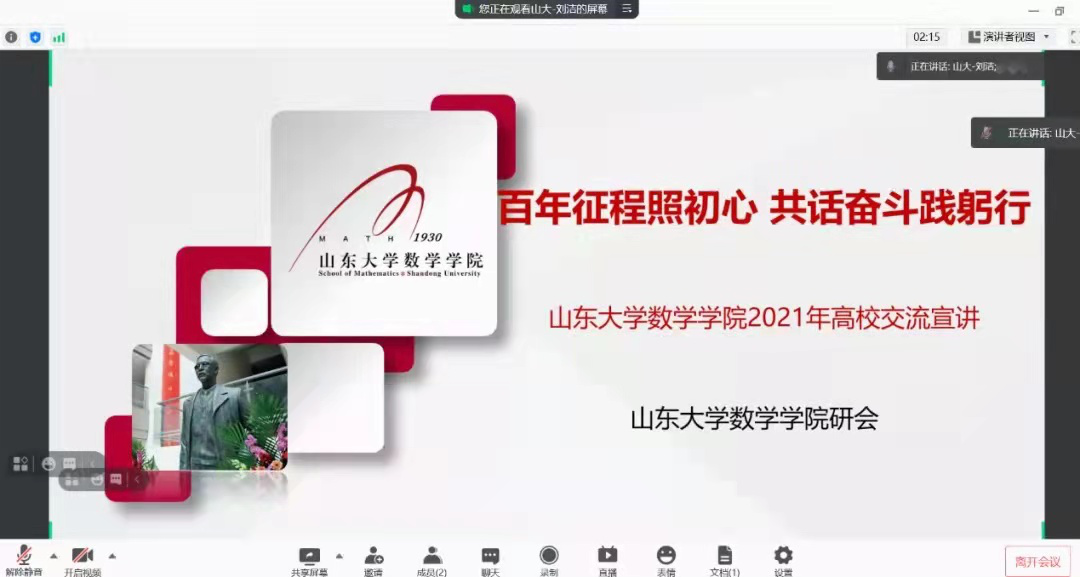 2021年7月8号星期四,3003新葡的京集团同北京大学3003新葡的京集团、复旦大学数学科学学院、北京师范大学3003新葡的京集团线上开展了“百年征程照初心、共话奋斗践躬行”高校研究生会宣讲交流活动。