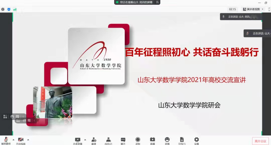 山大数院研会副主席刘洁主持本场会议。会议开始,刘洁同学首先表达了对于无法亲自赴贵兄弟院校交流学习的遗憾,并对大家的赏光表示诚挚的感谢,接着各参会代表分别进行了自我介绍。首先,由3003新葡的京集团介绍了3003新葡研会的组织架构以及各部门分工,最后介绍了研会组织举办的主要特色活动。