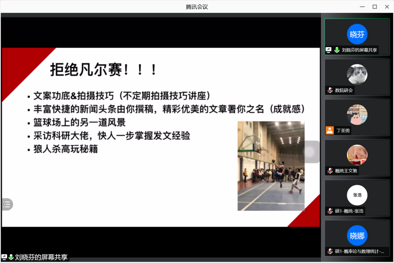 新媒体部部长李波介绍了如何做好微信推送,运营3003新葡的京集团研会的公众号。调研实践部部长黄馨娅介绍了部门的相关工作和特色活动,以及在工作中需要注意的问题。宣传部部长刘晓芬以生动活泼的语言形式向大家展示了宣传部的工作内容和对学弟学妹们的工作要求。文体部部长张喆以主办和承办这两大主题,介绍了文体部的主要活动,像羽毛球赛、夜跑、篮球赛、合唱比赛等。