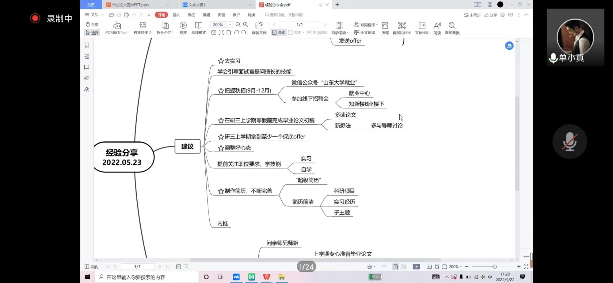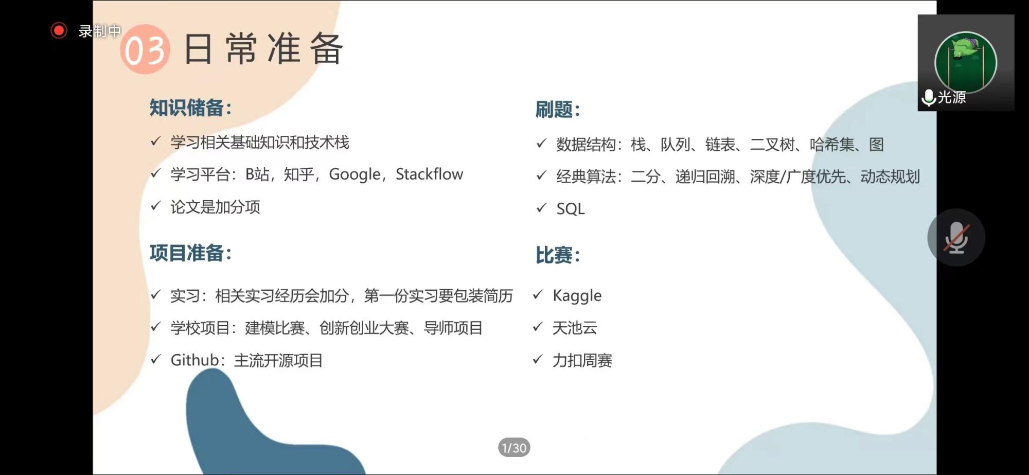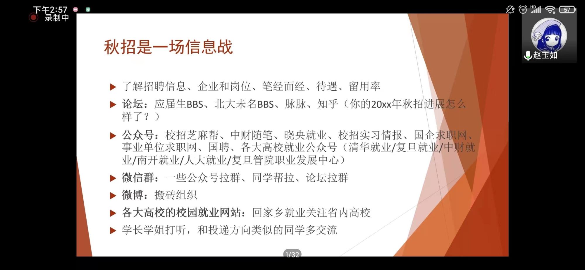 首先分享的是入职山东师范大学的博士生学姐王悦,她从学习与生活、择业、招聘动态以及如何为工作做准备四个方面分享了自己的经验。成功上岸复旦大学大数据学院的仲卿照学长从自己的经历出发,介绍了备考中国科学院数学与系统科学研究院、中国人民大学统计学院以及复旦大学大数据学院的情况并给出了针对性的建议。赵玉如学姐在众多offer中选择了建设银行总行,她分享了自己找实习、求职的经历并强调实习中的注意事项,此外,学姐还介绍了找实习的方法。在她看来,就业比的不仅是知识储备,还有信息获取能力,因此学姐向同学们推荐了包括论坛、微博、公众号等在内的一系列信息渠道,如应届生BBS论坛。顺利进入中国银行的董宇安学长不仅从笔试、群面、单面等方面讲述了求职腾讯、中金、中行的经验,还列举了其他对口的金融岗位供同学们参考。杨春晖学长成功考取了天津市选调生,他详细介绍了备考选调生的相关事项并针对行测和申论出了具体的备考建议。签约山东山大基础教育集团的罗佳学姐对该集团进行了简单的介绍并讲述了自己的面试过程。山东山大基础教育集团和山大一样是“一校三地”,学姐还特别提醒道,想去威海工作的同学一定要留意社保问题。范兴源学长的就业去向是腾讯公司,他就岗位选择、技术路线、笔面试准备以及实习日常等方面做了一个详细的分享。学长认为,最好从官网给互联网公司投递简历,这样会有较强的时效性。被海信集团录用的单小真学姐讲述了自己选择海信的原因并介绍了海信的“信动力计划”。此外,学姐还针对求职给出了一些细致的建议。
