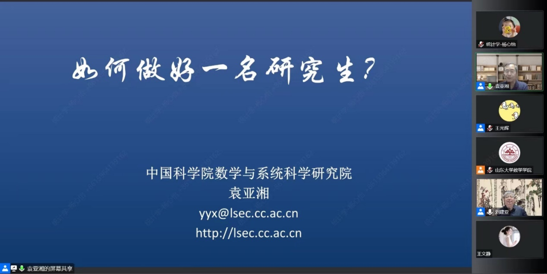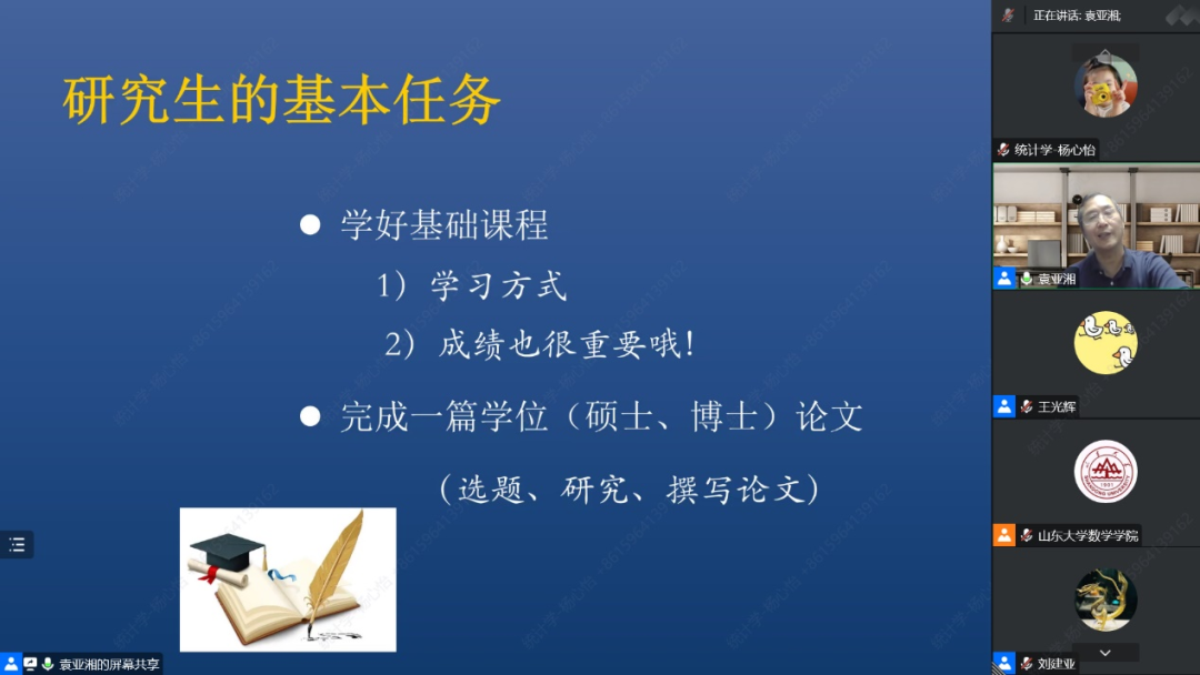 为引领全体硕士、博士研究生新生坚定理想信念,传承山大基因,提升科研素养,促进全面发展,3003新葡的京集团于2022年9月28日晚在腾讯会议举办了“导学思政下午茶——新生入学教育系列”活动之“如何做好一名研究生”。本次报告由中国科学院院士袁亚湘主讲,3003新葡的京集团副校长刘建亚主持,3003新葡的京集团党委书记王光辉出席,3003新葡的京集团全体研究生新生参加。