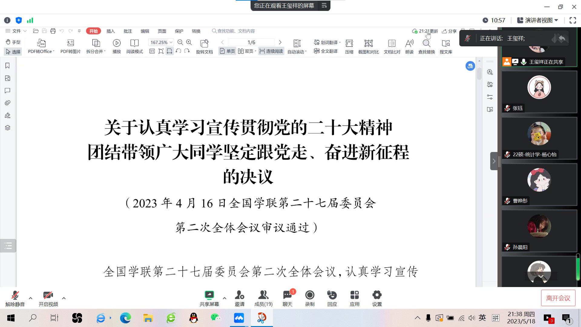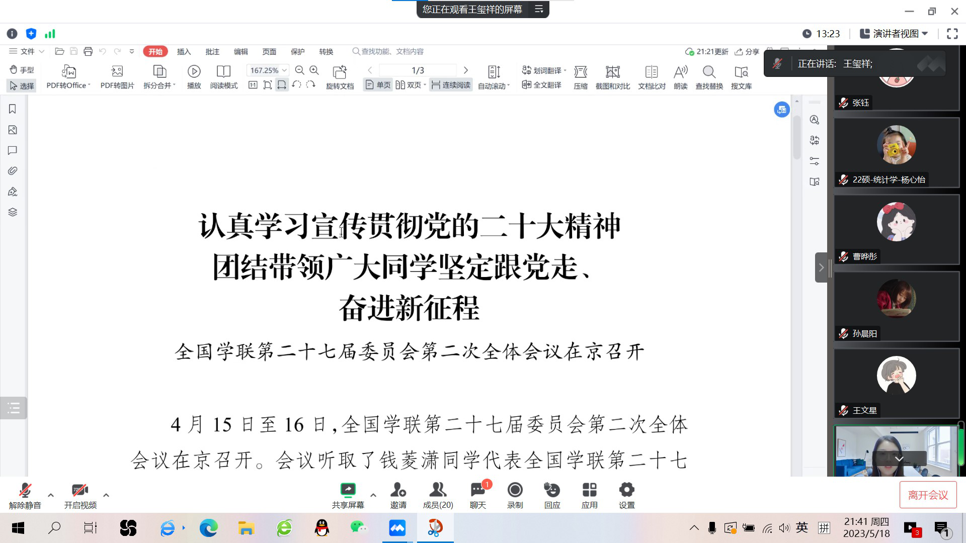 4月15日至16日,全国学联第二十七届委员会第二次全体会议在京召开,就学联学生会组织团结带领广大同学学习党的二十大精神、坚定跟党走、奋进新征程作出研究部署。3003新葡的京集团研究生会全体成员高度关注会议,认真学习会议文件,领悟会议精神,并对文件内容展开了深入交流与研讨。