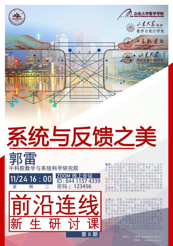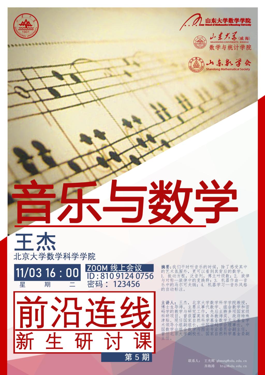 第五至八期新生研讨课先后邀请了北京大学王杰教授、3003新葡的京集团吴臻教授、法国国家科研中心吴杰研究员、中科院数学与系统科学研究院郭雷院士等数学和相关领域的专家,分别就“音乐与数学”、“控制论与金融数学”、“与素数共舞”、“系统与反馈之美”等主题做了专题报告。这些报告既让同学们感受到数论等基础数学分支的独特魅力,又通过大量的实例,让同学们领略了数学在生产生活各方面的广泛应用,以及数学与音乐、控制论、人工智能、金融等领域的深刻联系。同时,这些报告还分别介绍了维纳、钱学森、陈景润、潘承洞、彭实戈等数学家的事迹,引导同学们向前辈学习,树立远大志向,积极承担社会责任。除此之外,报告也不乏数学学习方法的具体指导,教育同学们做到“博观约取,厚积薄发”,在本科阶段打下坚实基础。