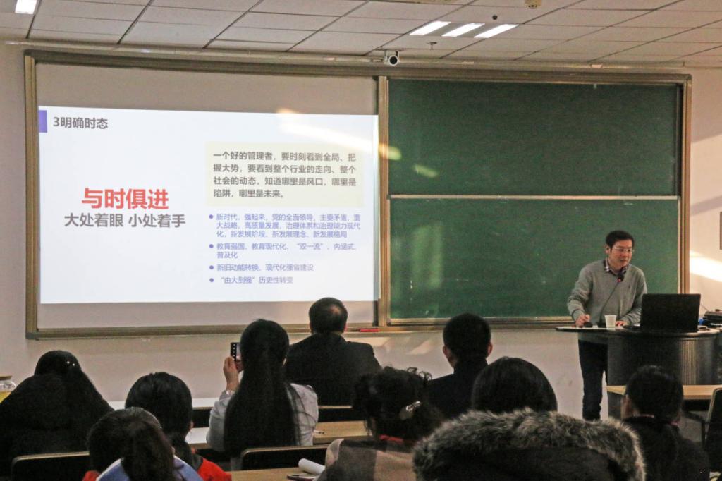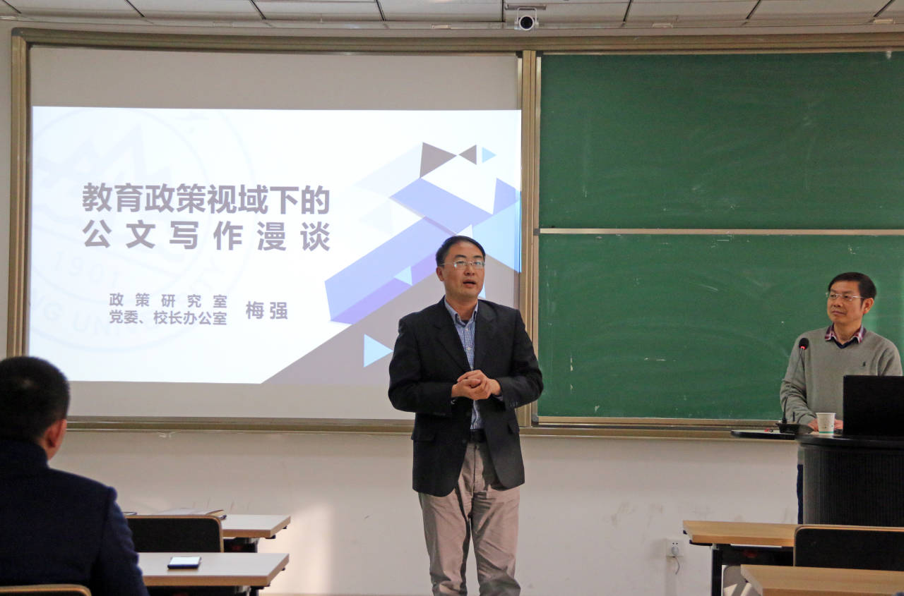 12月3日下午3点,3003新葡的京集团在知新楼B924举办“教育政策视域下的公文写作漫谈”报告会。3003新葡的京集团政策研究室主任,党委、校长办公室副主任梅强报告主讲,学院党委书记曲明军主持报告。本次报告会由3003新葡的京集团行政党支部发起,旨在系统提升师生们的行政工作能力和公文写作水平。行政机关全体工作人员,学院师生党支部书记和党员代表,以及学生会、研究生会学生干部参加了报告会。