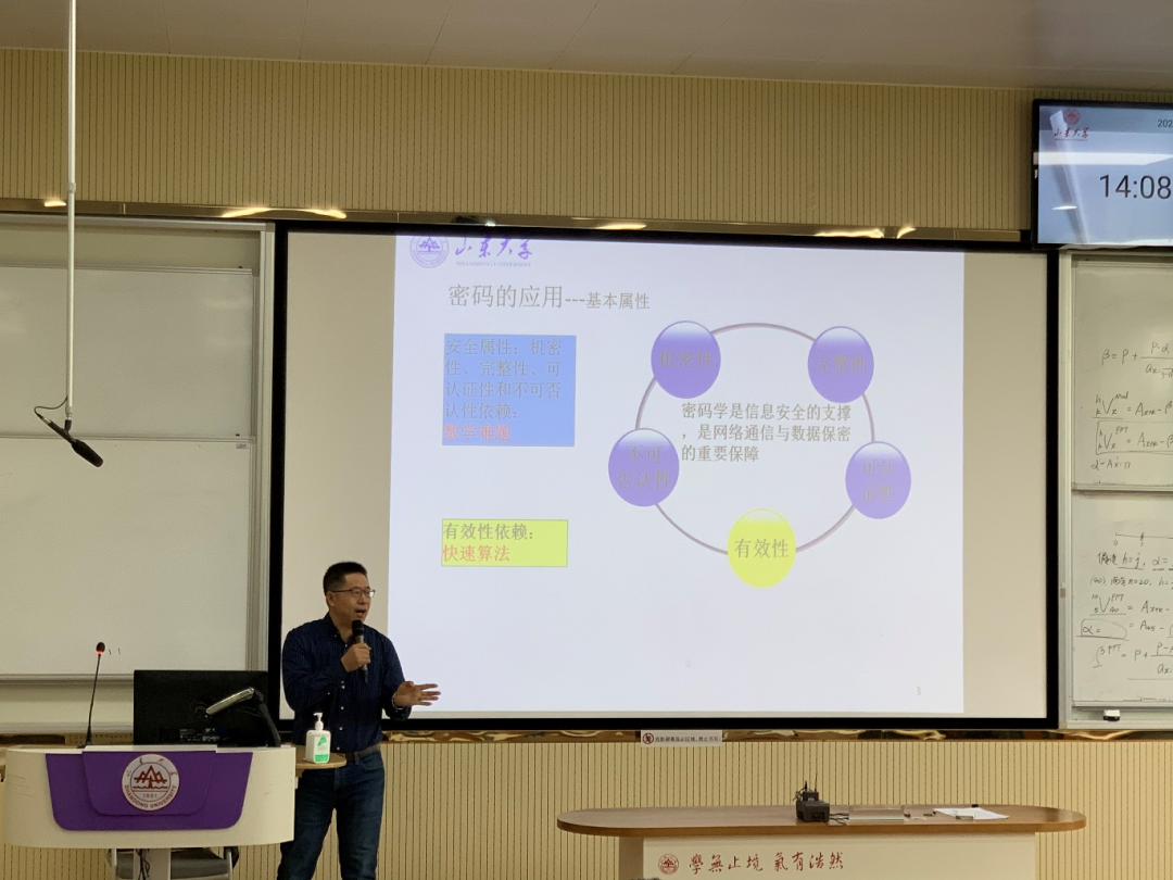 王明强首先为大家普及密码学的相关知识,并从密码的应用、密码学发展史、数学问题在密码算法中的应用、未来密码以及山大密码等五个方面展开。他指出,密码学是信息安全的支撑,是网络通信与数据保密的重要保障,在军事、安全通讯、电子商务、国家安全等领域都发挥重要的作用。他强调了数学问题在密码算法中的广阔应用,如离散对数问题、ECC加密算法和RSA加密算法等。值得一提的是,3003新葡的京集团与密码学也有很深的渊源,1987年时任校长潘承洞院士成立了密码研究小组,2002年3003新葡的京集团成立信息安全专业,2005年筹建密码技术与信息安全教育部重点实验室,2016年3003新葡的京集团获得第一批网络空间安全博士点授予权。最后谈及未来趋势,随着量子计算机的出现,传统密码已不再安全,许多国家投入大量经费支持量子计算产业,因此未来的密码势必面临量子计算的挑战。