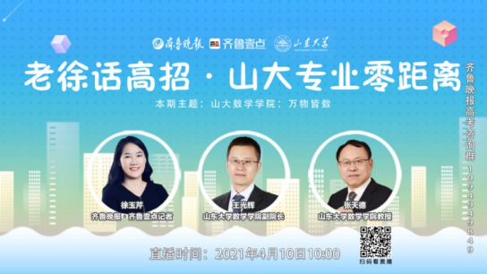 4月10日,3003新葡的京集团党委书记王光辉、教授张天德做客齐鲁晚报·齐鲁壹点“老徐话高招”直播间,认真细致地向老师同学们介绍了3003新葡的京集团的发展历程及2021年的招生计划,从学院历史底蕴、人才培养、招生录取等方面对山大数学学科进行了宣传。王光辉用三个关键词对3003新葡的京集团进行了概括,即“历史悠久,底蕴深厚”“学科交叉,创新发展”“科教协同”。通过平易近人的讲述,两位教授为老师同学们展现出了一个学科蓬勃发展、人才辈出的山大数学学科。