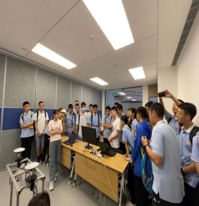 研学活动中,学生代表首先参观了山东国家应用数学中心展厅。尹上为参加研学活动的老师和学生介绍了中心成立的背景,并向学生们展示了中心在金融、人工智能、信息技术、海洋能源、智能制造、生物医学等领域的应用成果。参观过程中,学生代表体验了混合现实技术和无创血糖仪项目产品,对数学促进科技进步和人民生活水平提高有了更加直观的认识。在参观机器人创新实验室时,项目负责人向学生展示了最新的“机场清障”机器人样机,让学生们对数学在人工智能和控制领域发挥的变革性作用有了深刻的理解。