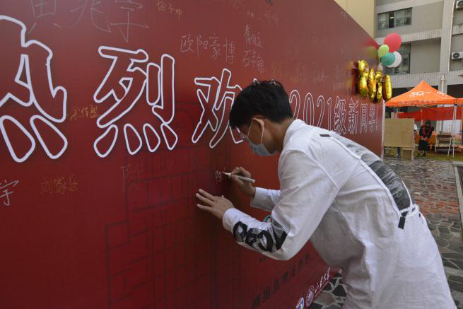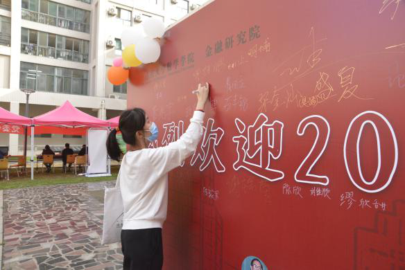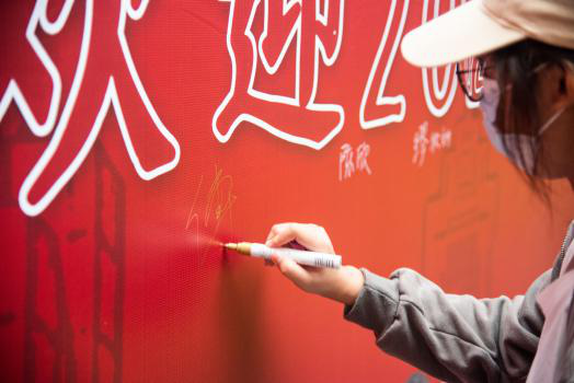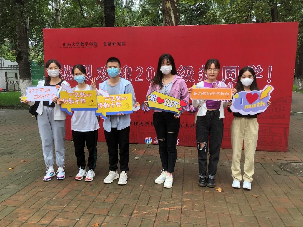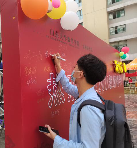 为增强2021级新生报到的幸福感、归属感,学院精心设计了签名合影墙,吸引了许多同学在此拍照留念,留下一幅幅珍贵的青春靓丽的画面。在领取了新生大礼包后,小“数”苗们纷纷跑到签名墙上签下自己的名字,并与签名墙合了影,正式成为了“官方认证”的山大数院人!