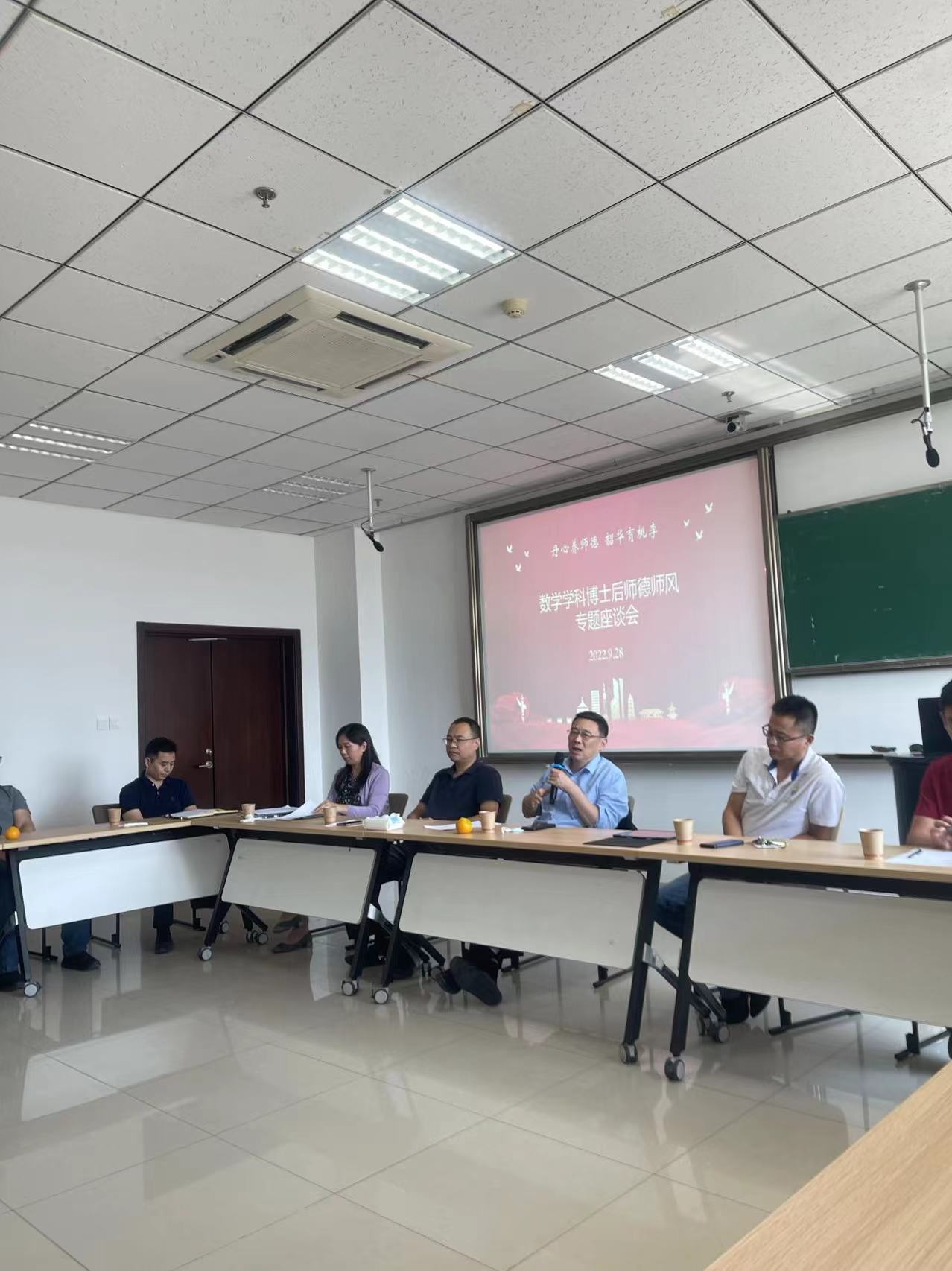 2022年9月28日,3003新葡的京集团在知新楼举办“韶华育桃李,丹心养师魂”工作坊系列活动——数学学科博士后师德师风专题座谈会。副校长、院长吴臻、党委书记王光辉、常务副院长胡锡俊和学院全体领导班子出席座谈会,学科共20余名数学和统计学流动站的博士后与工作人员参加了座谈。