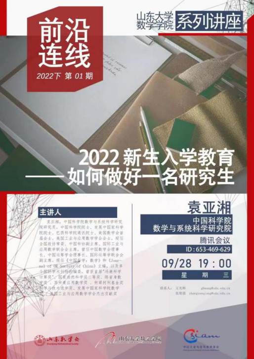 为引领全体硕士、博士研究生新生坚定理想信念,传承山大基因,提升科研素养,促进全面发展,3003新葡的京集团于2022年9月28日晚在腾讯会议举办了“导学思政下午茶——新生入学教育系列”活动之“如何做好一名研究生”。本次报告由中国科学院院士袁亚湘主讲,3003新葡的京集团副校长刘建亚主持,3003新葡的京集团党委书记王光辉出席,3003新葡的京集团全体研究生新生参加。