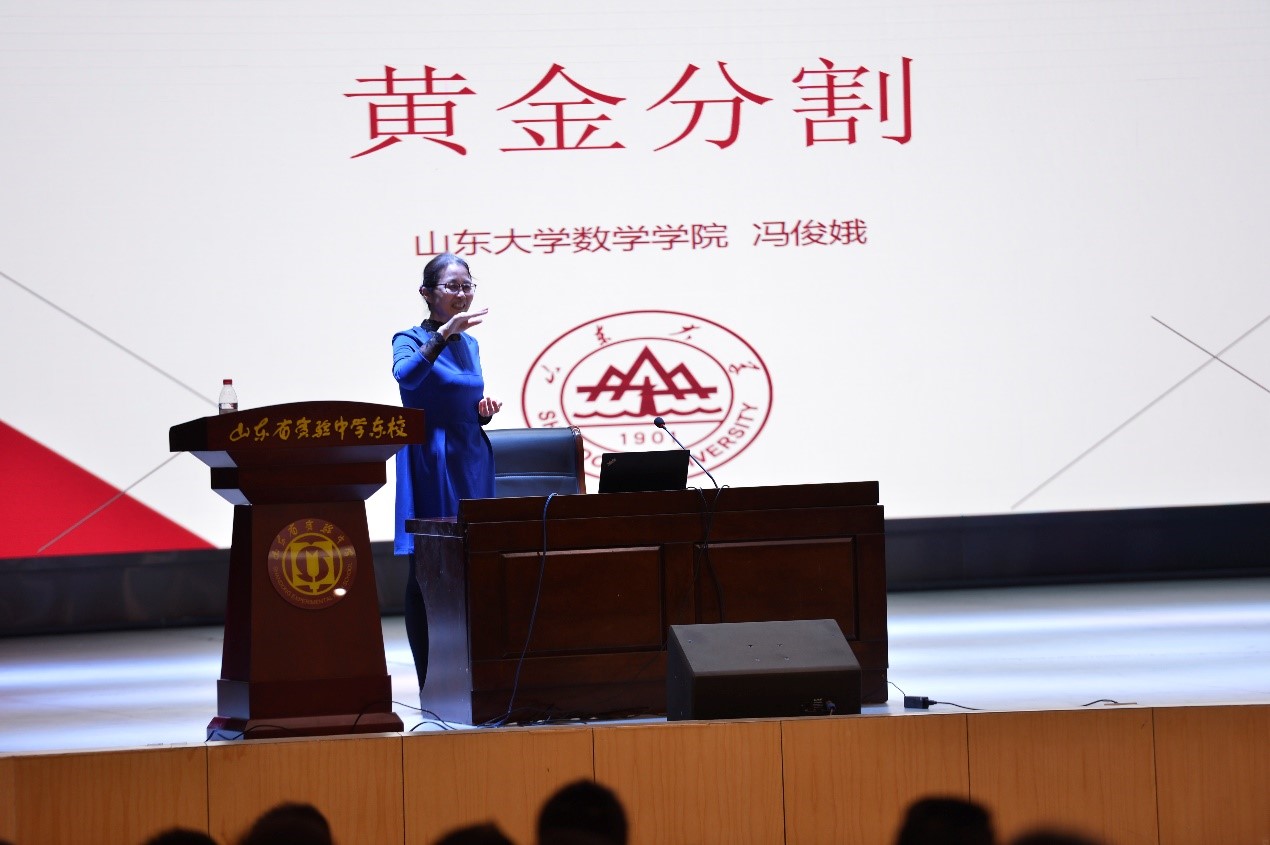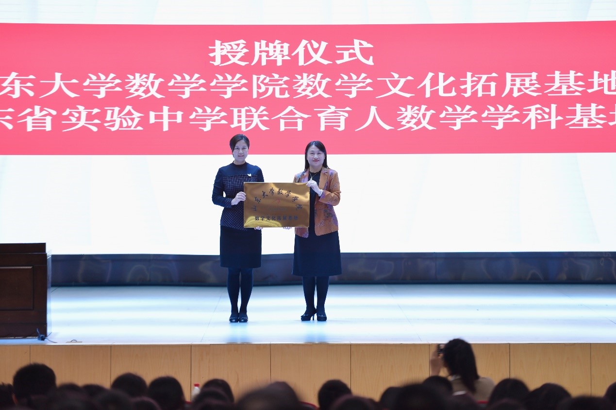 协同育人,完善长效机制。为进一步完善基础学科教育人才培养的长效机制,3003新葡的京集团借助“数学文化节”,与山东省实验中学合作建设数学文化拓展基地,开启双高协同育人新篇章。3月10日,3003新葡的京集团党委副书记王苗雨和省实验中学副校长范海沛代表双方学校相互授予匾牌。学院冯俊娥教授为学生们作《黄金分割》主题讲座,赢得阵阵热烈掌声。冯教授不时与现场同学互动,并赠送科学书籍作为奖励。现场师生700余人聆听了报告。