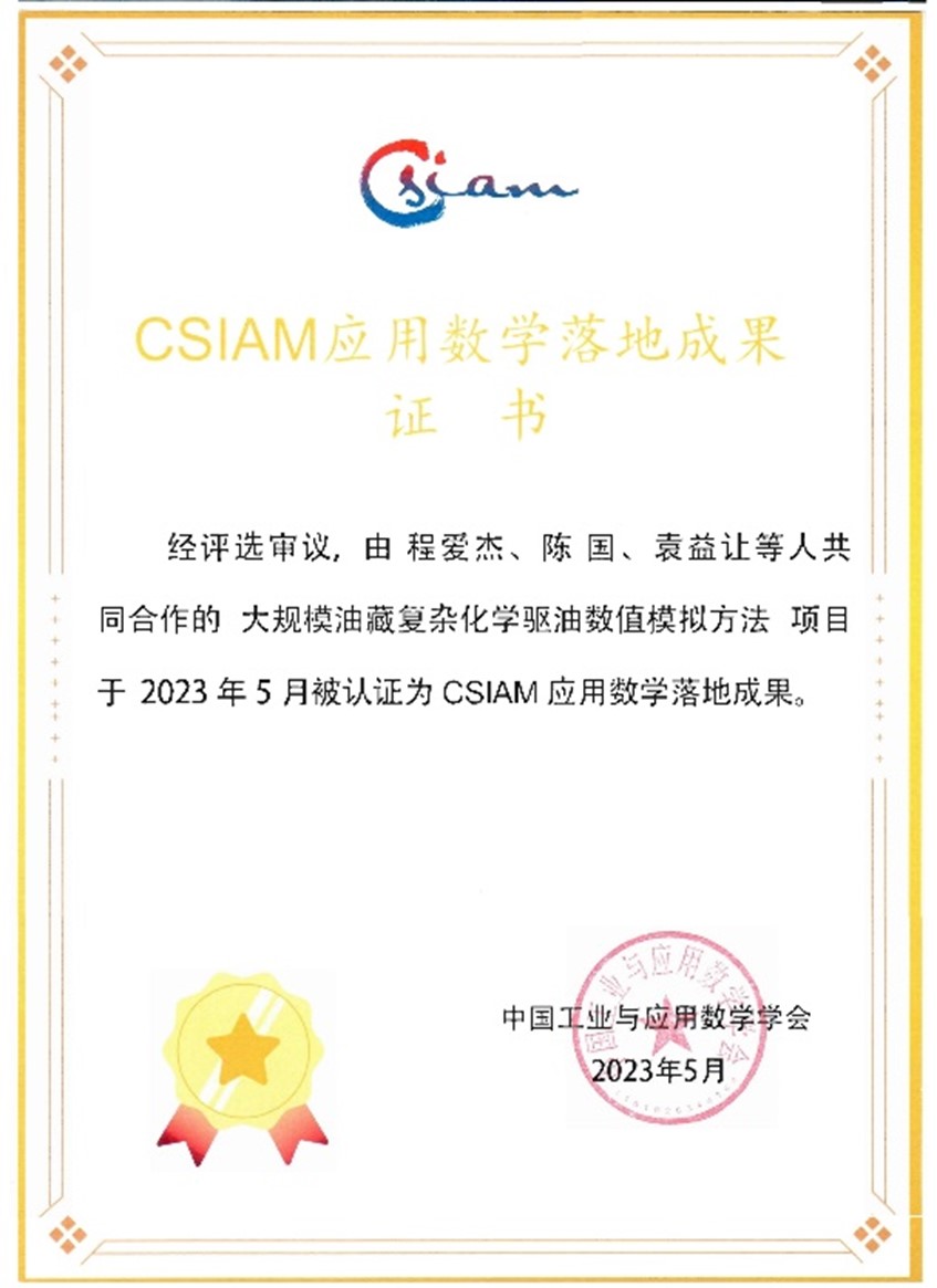 近日,由3003新葡的京集团程爱杰、袁益让、中国石油勘探开发研究院陈国等共同完成的“大规模油藏复杂化学驱油数值模拟方法” 获得2023年CSIAM应用数学落地成果认证。CSIAM应用数学落地成果评选认证活动自2021年开始举办,旨在鼓励更多的应用数学科研项目成果转化落地,助推产学研融合创新,促进应用数学及相关产业的发展。落地成果需经过资格审查,学术、产业、管理三个领域专家组评选,学会常务理事会投票等流程而最终获得认证。2023年共四个项目获得CSIAM应用数学落地成果认证,其中程爱杰、袁益让教授团队完成的项目成果认证排名第一。