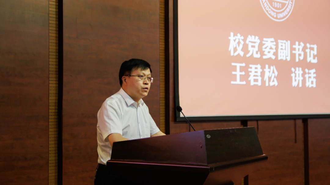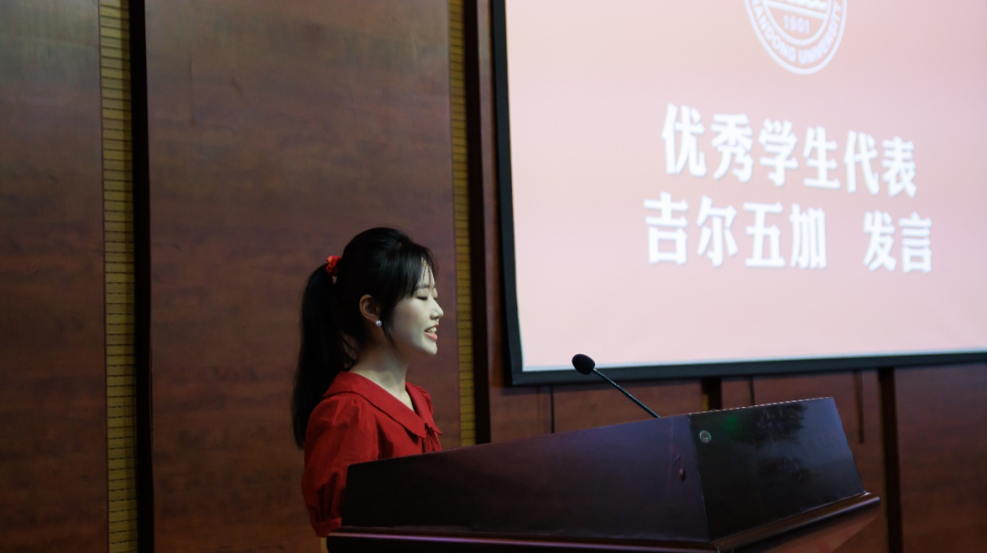 王君松代表学校向同学们表示祝贺,向辛勤培育同学们成长成才的相关部门、学院及老师们表示衷心感谢。他表示,广大青年要坚定不移听党话、跟党走,怀抱梦想又脚踏实地,敢想敢为又善作善成,立志做有理想、敢担当、能吃苦、肯奋斗的新时代好青年。他对同学们提出三点希望:一是铸牢中华民族共同体意识,促进各民族在中华民族大家庭中像石榴籽一样紧紧抱在一起。二是持续涵养家国情怀,赓续山大红色血脉和家国情怀,弘扬爱国之情,砥砺强国之志,在服务国家、服务社会、服务人民的过程中书写人生芳华。三是脚踏实地,练就过硬本领,从实践中获得知识和力量,把人生之根和事业之根深扎在祖国大地上,努力成为可堪大用、能担重任的栋梁之才。
