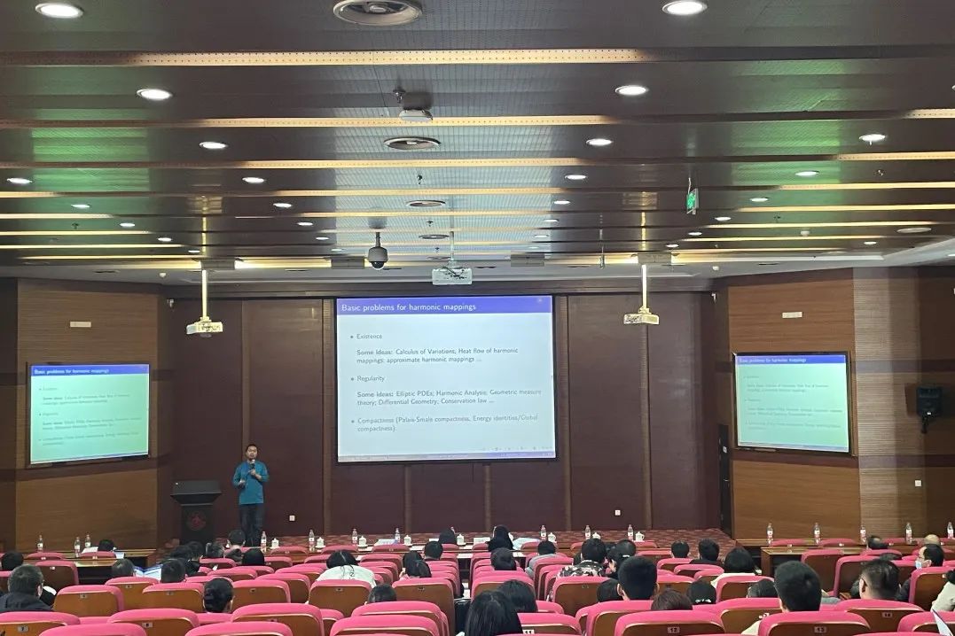 本次年会邀请院士、专家学者等,探讨数学前沿领域和热点问题。专家报告由彭实戈院士主持。张伟平院士以“从三角形到流形-Atiyah-Singer指标定理简介为题”,风趣幽默、深入浅出地带领与会师生徜徉几何学历史,介绍被誉为二十世纪数学最重要定理之一的Atiyah-Singer指标定理,寄语与会师生充分开展基础前沿研究,推进数学与物理交叉融合。李嘉禹教授以“On the Symplectic Mean Curvature Flows”为题做精彩报告,3003新葡的京集团郭常予教授、山东财经大学李娜教授、烟台大学郑甲山教授分别以“Quantitative Stratification of the Singular Set of Harmonic Maps and Extensions”“Policy Iteration Reinforcement Learning Method for Continuous-Time Mean-Field Linear-Quadratic Optimal Problem”“Eventual Smoothness and Stabilization in a Three-dimensional Keller-Segel-Navier-Stokes System with Rotational Flux”为题做学术分享。