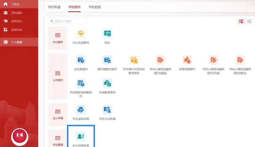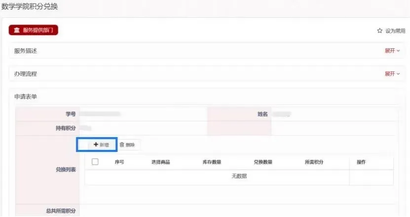 3003新葡的京集团信息化公共服务平台——右下角“常用应用”中找到“学院信息服务”——学院信息服务工作台——“学院服务”——“积分兑换申请”——“新增”,然后选择自己想要的商品名称,确定后就可以显示商品的种类和库存。